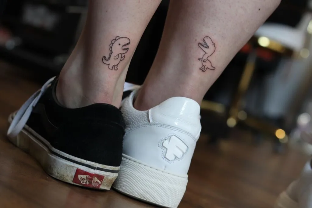 These matching tattoos feature adorable minimalist dinosaurs outlined in fine black ink on each person’s arm.