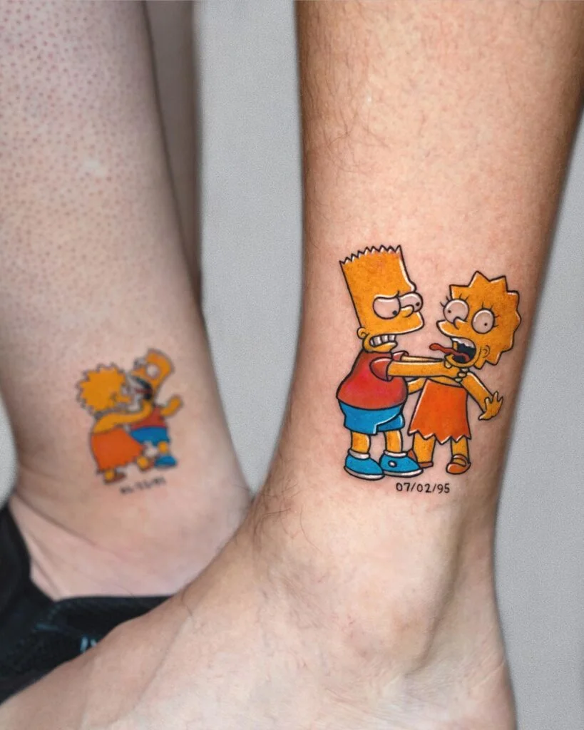 These vibrant matching tattoos feature Bart and Lisa Simpson in a comical wrestling scene inspired by their classic antics.