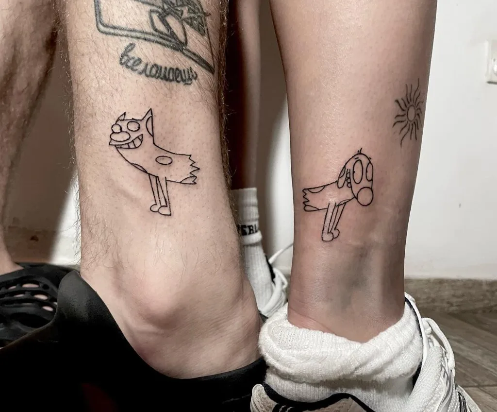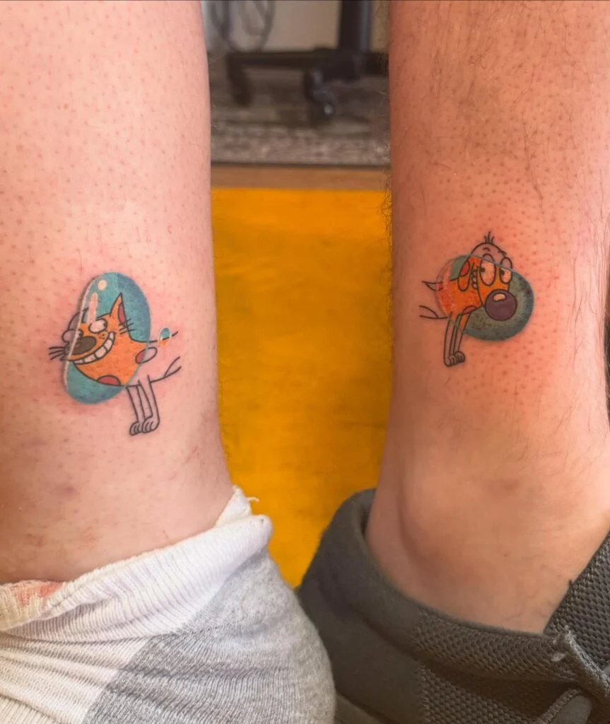These matching tattoos creatively feature CatDog, the quirky two-headed character known for its fun and chaotic personality.