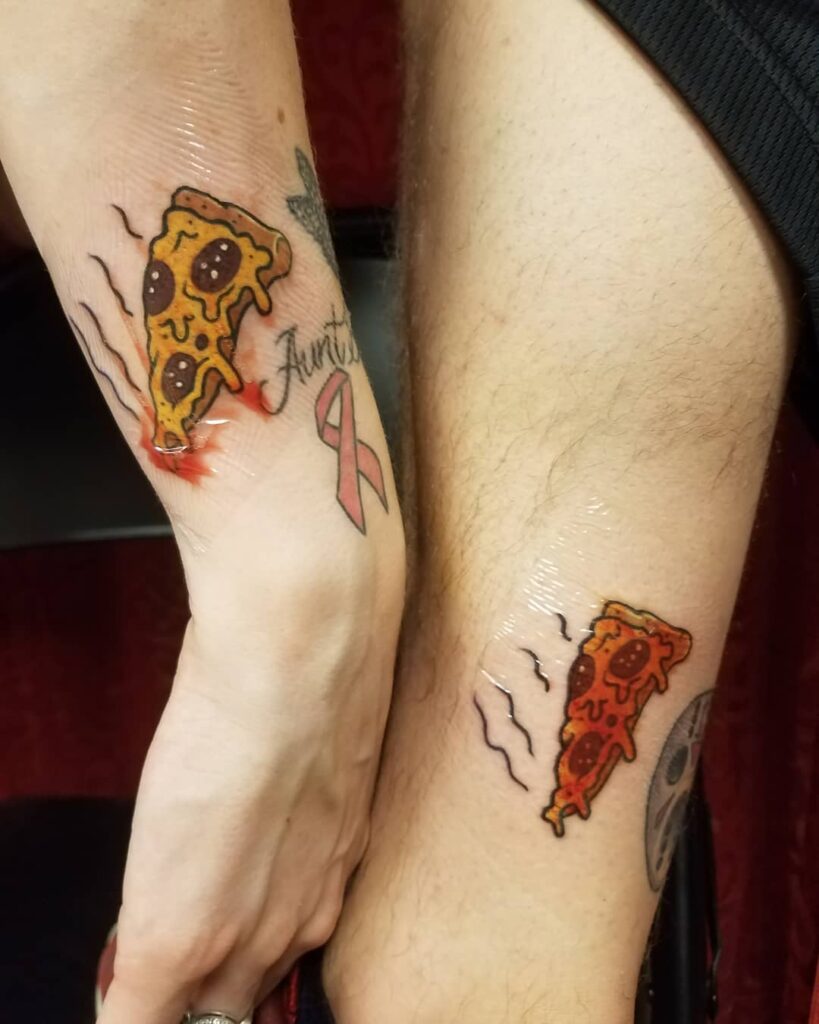 These colorful matching tattoos feature gooey pepperoni pizza slices, perfect for couples or best friends who share food love.
