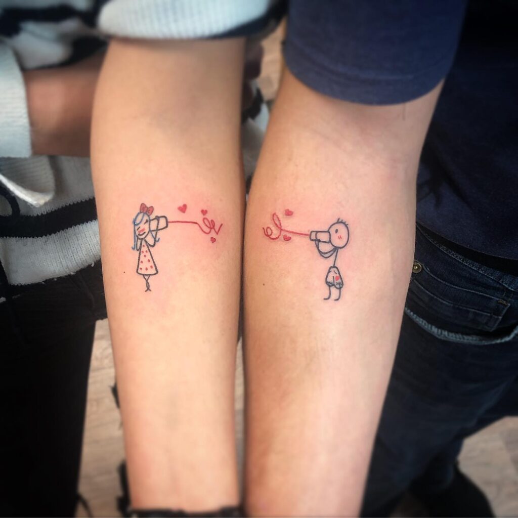 Positioned on the arm, these tattoos are easy to show off and make everyone smile. Perfect for best friends or long-distance couples, they celebrate communication, shared laughter, and a bond that stays strong no matter how far apart you are.