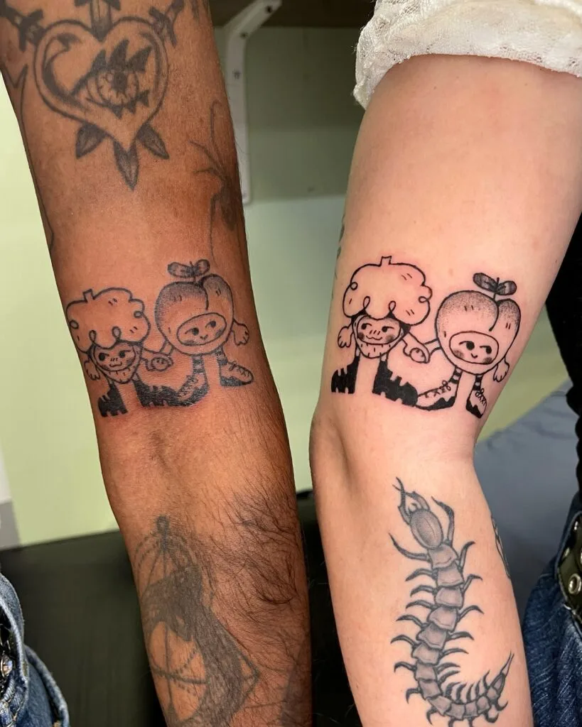 These matching tattoos show two adorable cartoon vegetables holding hands—one shaped like broccoli and the other like an apple.