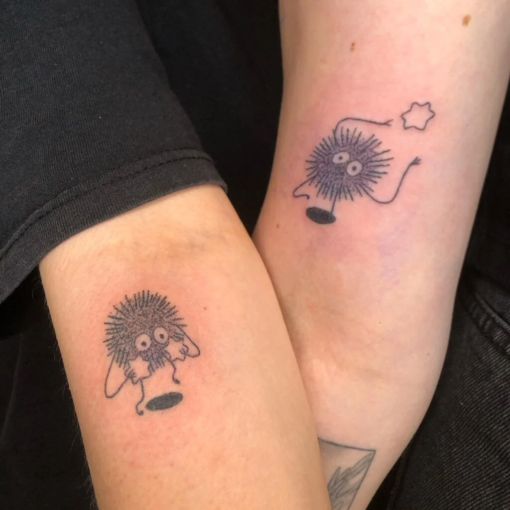 These matching tattoos feature spiky soot sprites with wide, surprised eyes and floating star-shaped candies.