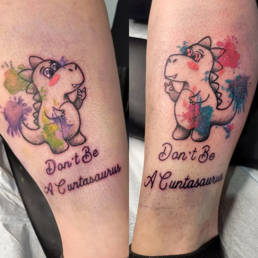These playful matching tattoos showcase cheerful dinosaurs with bright watercolor splashes of green, purple, and blue.