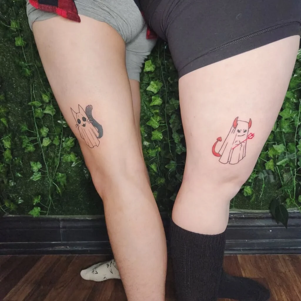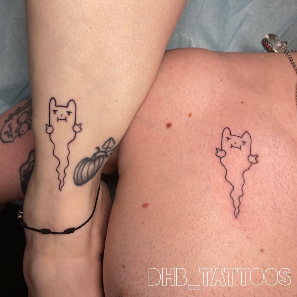 These matching tattoos feature a cute yet cranky ghost cat, blending spooky vibes with playful feline charm.