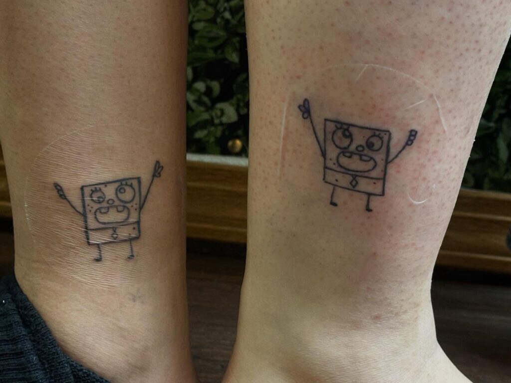 These matching tattoos feature a hilariously simplified SpongeBob with raised arms and a wide, excited grin.