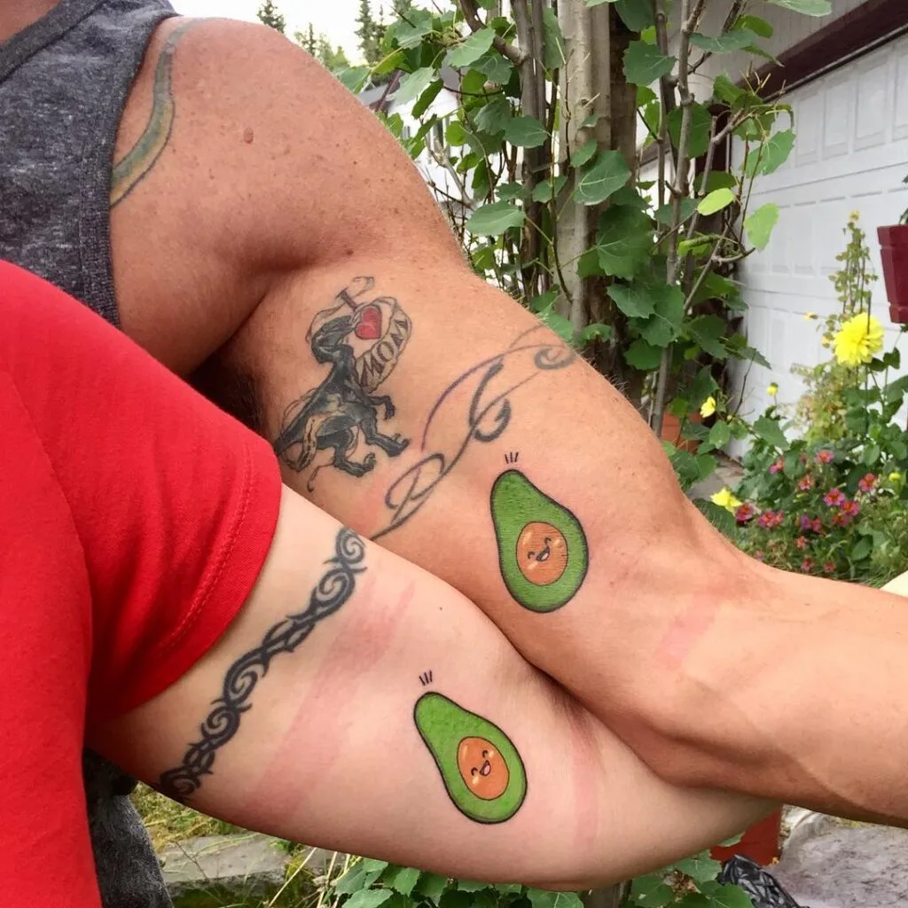 These adorable matching tattoos feature smiling avocado halves, making them perfect for couples or best friends who complete each other.