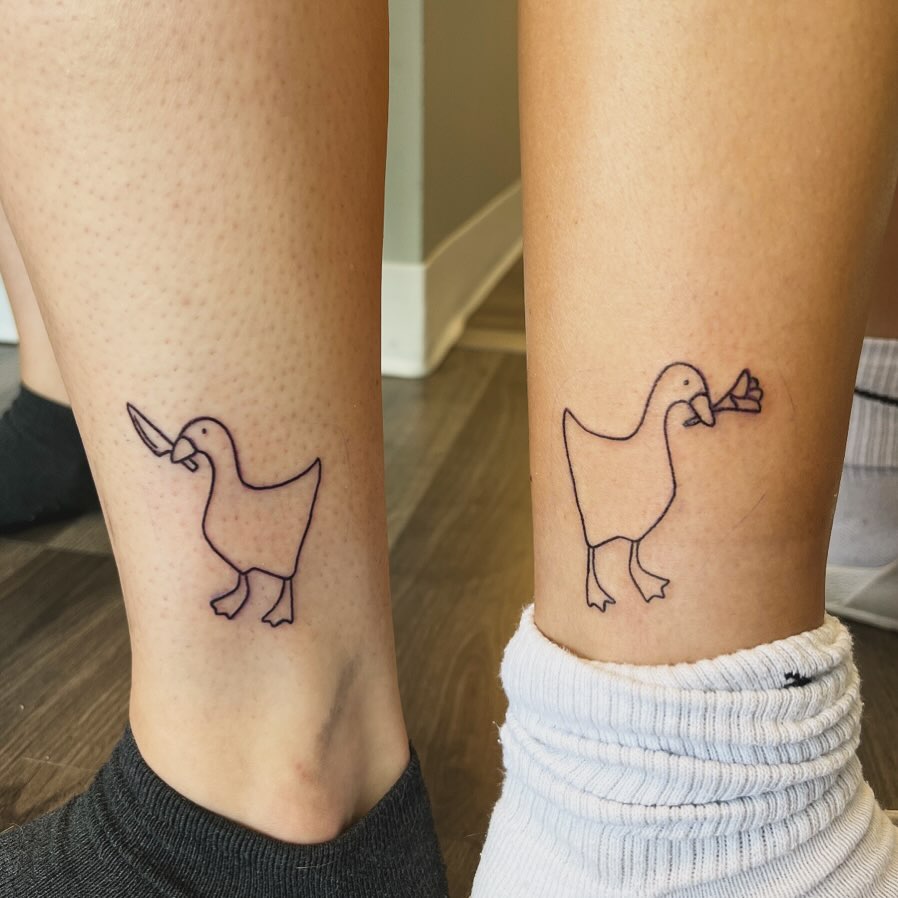 These matching tattoos show two comical geese, each bringing a totally different mood. One goose proudly holding a knife, the other sweetly carrying a tiny flower.
