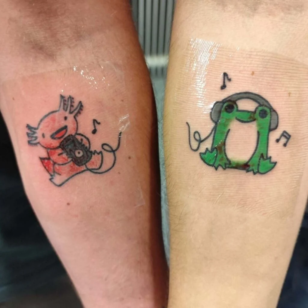 These matching tattoos showcase a cheerful axolotl and a happy frog enjoying music together in perfect harmony.