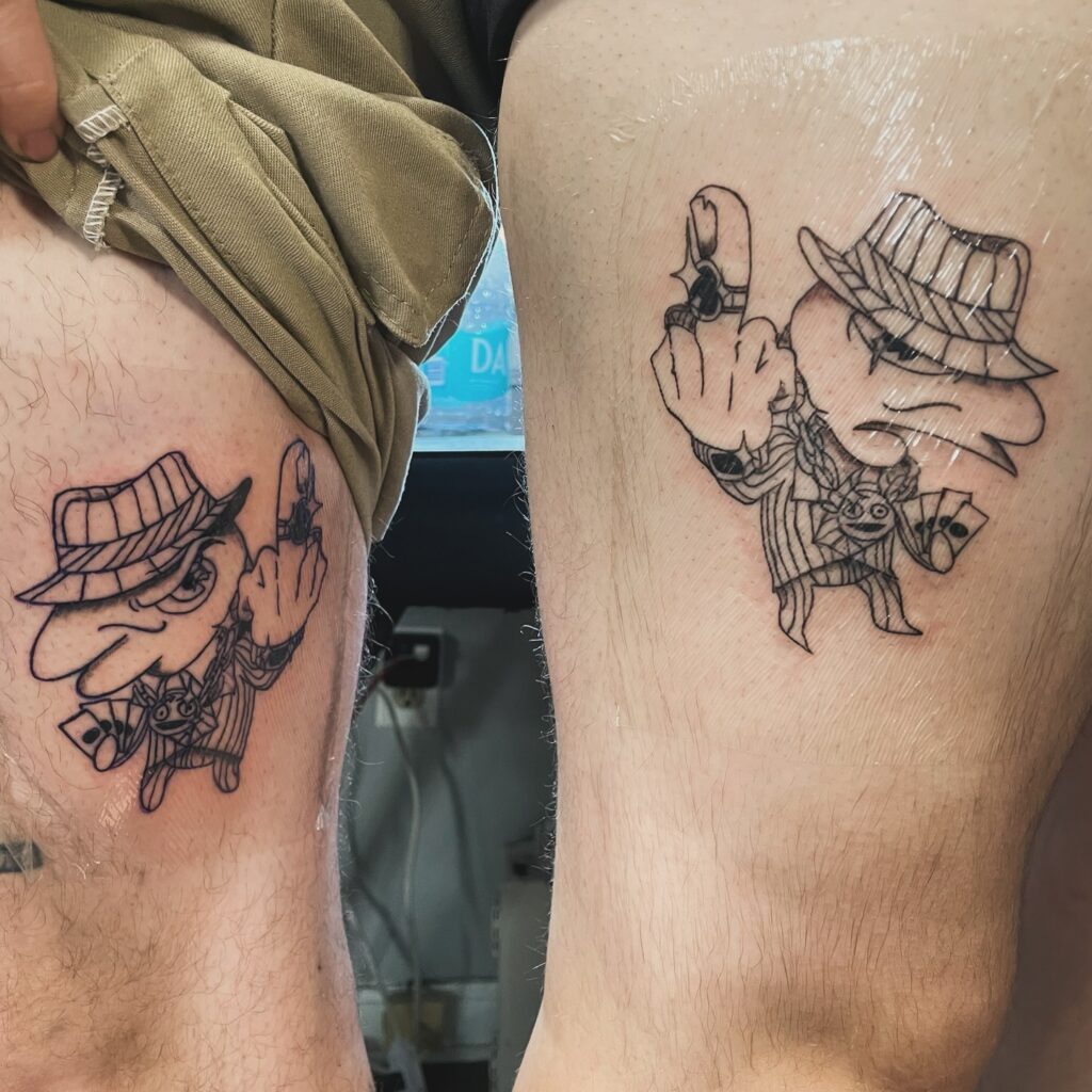These bold matching tattoos feature the quirky character Pimp Glep, dressed in a classic pinstripe suit and stylish hat.
