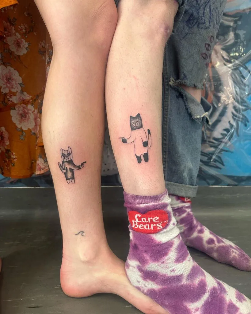 Placed near the lower leg, they create a fun and bold statement. Ideal for best friends or siblings, these tattoos celebrate an inseparable bond with a nostalgic and lighthearted twist.