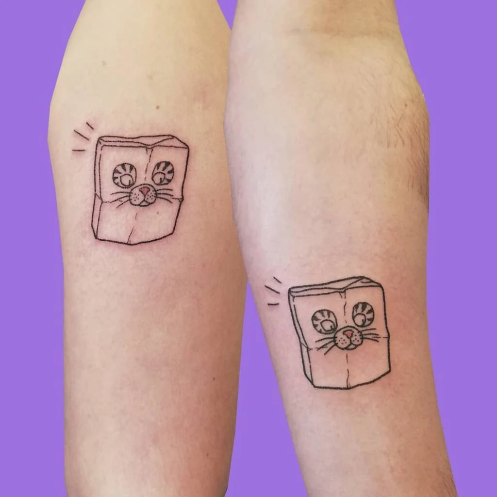 These quirky matching tattoos feature a curious cat peeking from a square paper bag.
