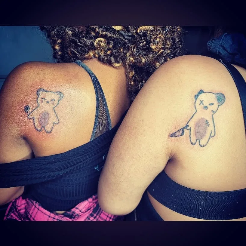 These matching shoulder tattoos feature two teddy bears with a mischievous twist.