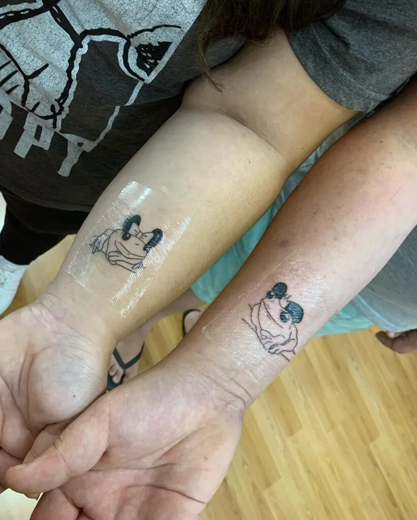 Perfect for best friends who grew up loving cartoons or simply share a goofy sense of humor, these tattoos celebrate fun, nostalgia, and a friendship that enjoys every laugh-filled adventure together.