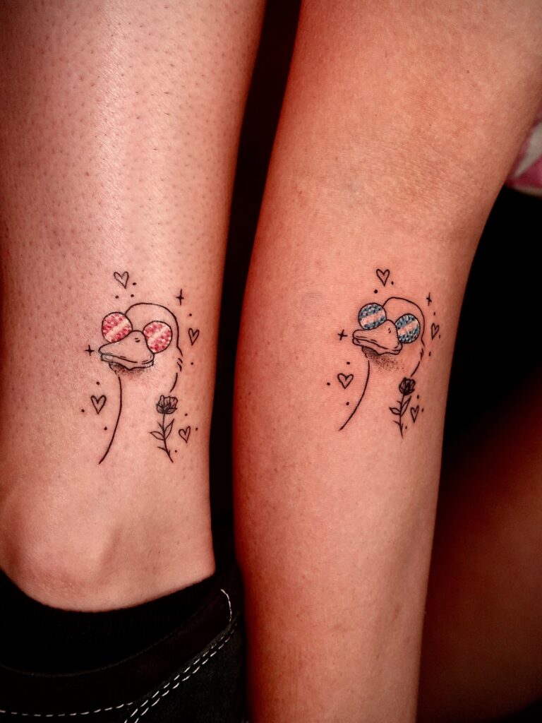 These matching tattoos feature relaxed ducks wearing sunglasses, perfectly blending humor with elegant floral details.