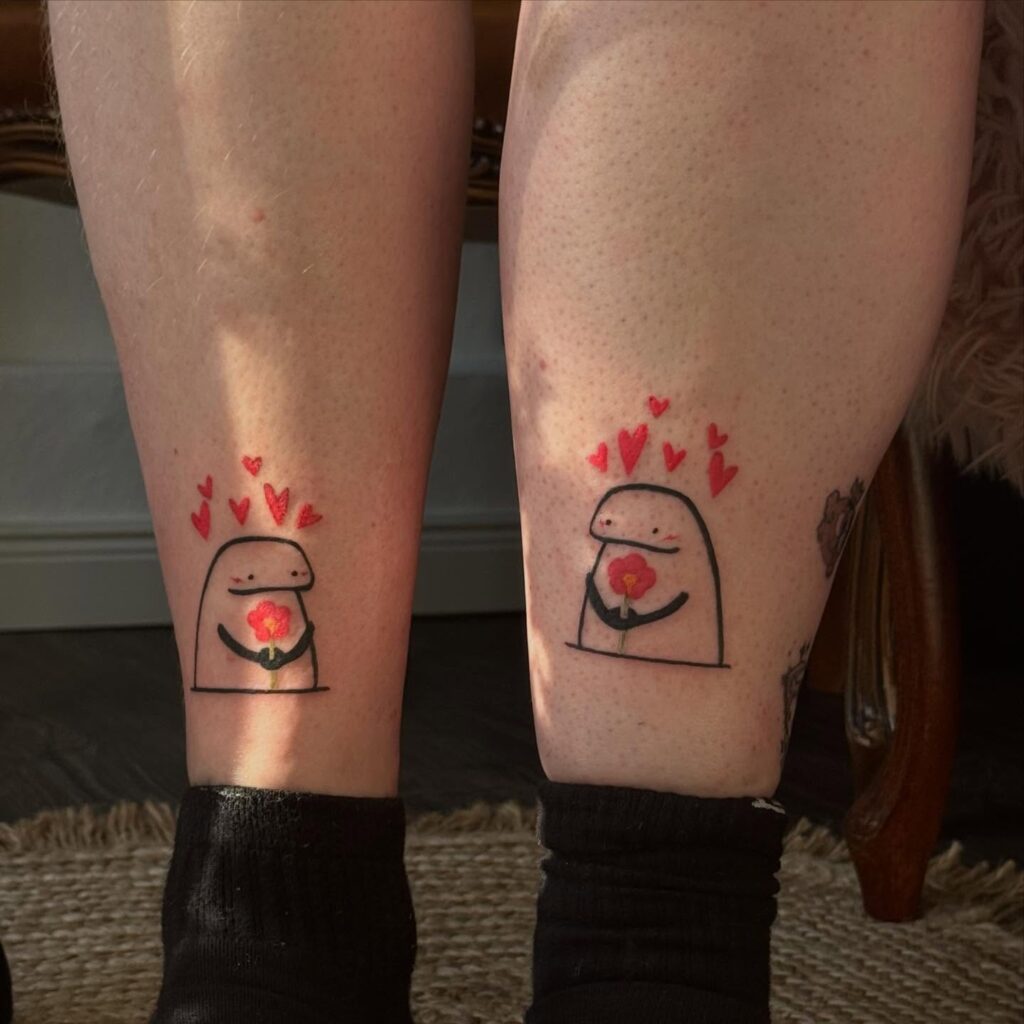 Placed on the lower leg, they’re easy to show off when wearing shorts. Perfect for best friends who love inside jokes, pop culture, and irony, these tattoos celebrate laughter and a friendship built on shared comedy.