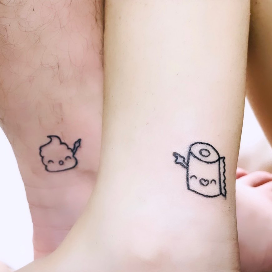 These playful matching tattoos show a smiling toilet paper roll and a cute poop emoji, turning bathroom humor into art.