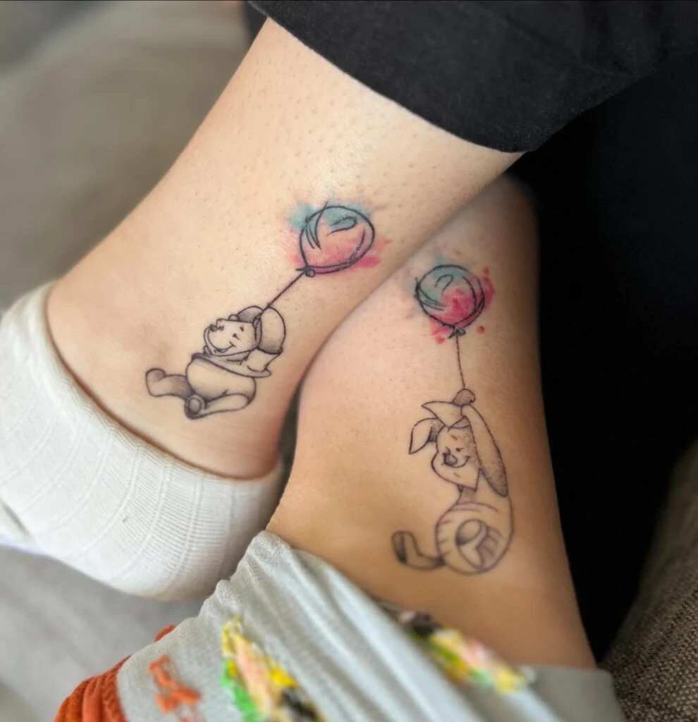 These delightful matching tattoos show Winnie the Pooh and Piglet floating with colorful balloons.