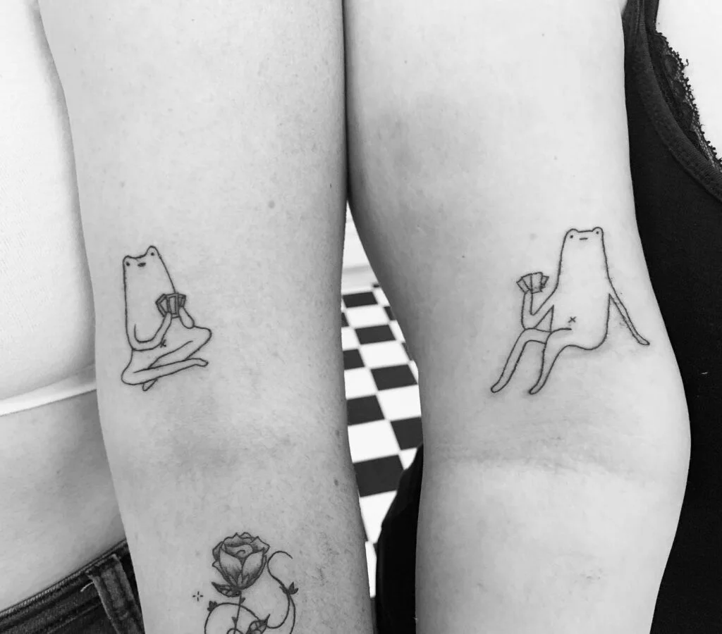 These quirky matching tattoos feature two relaxed cartoon frogs holding playing cards, perfectly capturing a fun game night vibe.
