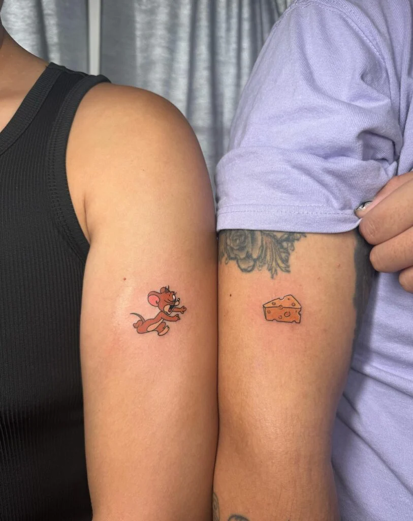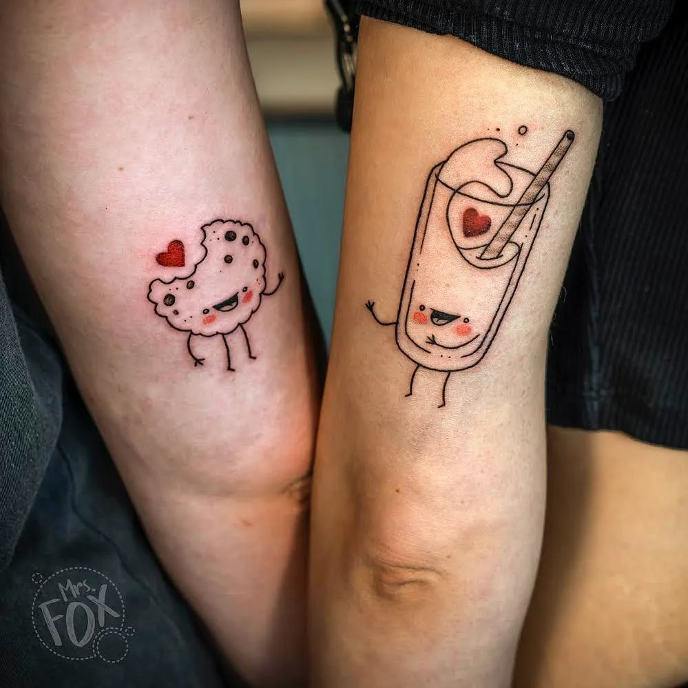 Matching tattoos don’t always have to be serious. They can be quirky, funny, and full of personality. Silly matching tattoos are perfect for best friends, siblings, or couples who love to share inside jokes and show off their lighthearted bond. These designs celebrate fun moments and unforgettable memories in the most unexpected ways.