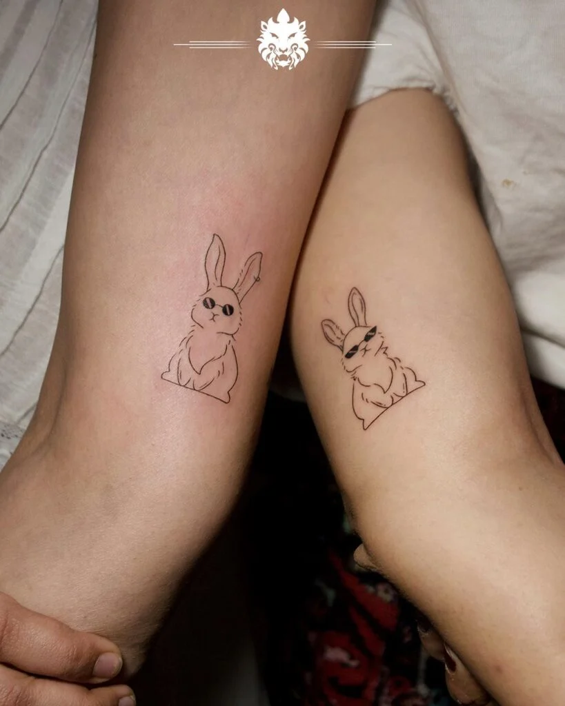These charming matching tattoos feature two delicate bunnies sitting upright, their clean outlines giving them a sweet, minimalist look.