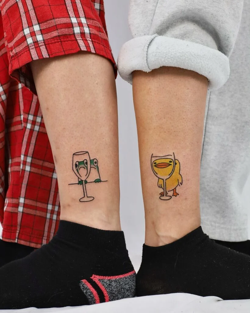These playful matching tattoos feature a quirky frog and a cheerful duck, each sitting inside a tall wine glass.