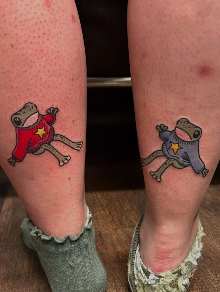 These colorful matching tattoos show two cheerful frogs dressed in cozy star-emblazoned sweaters, one red and one blue.
