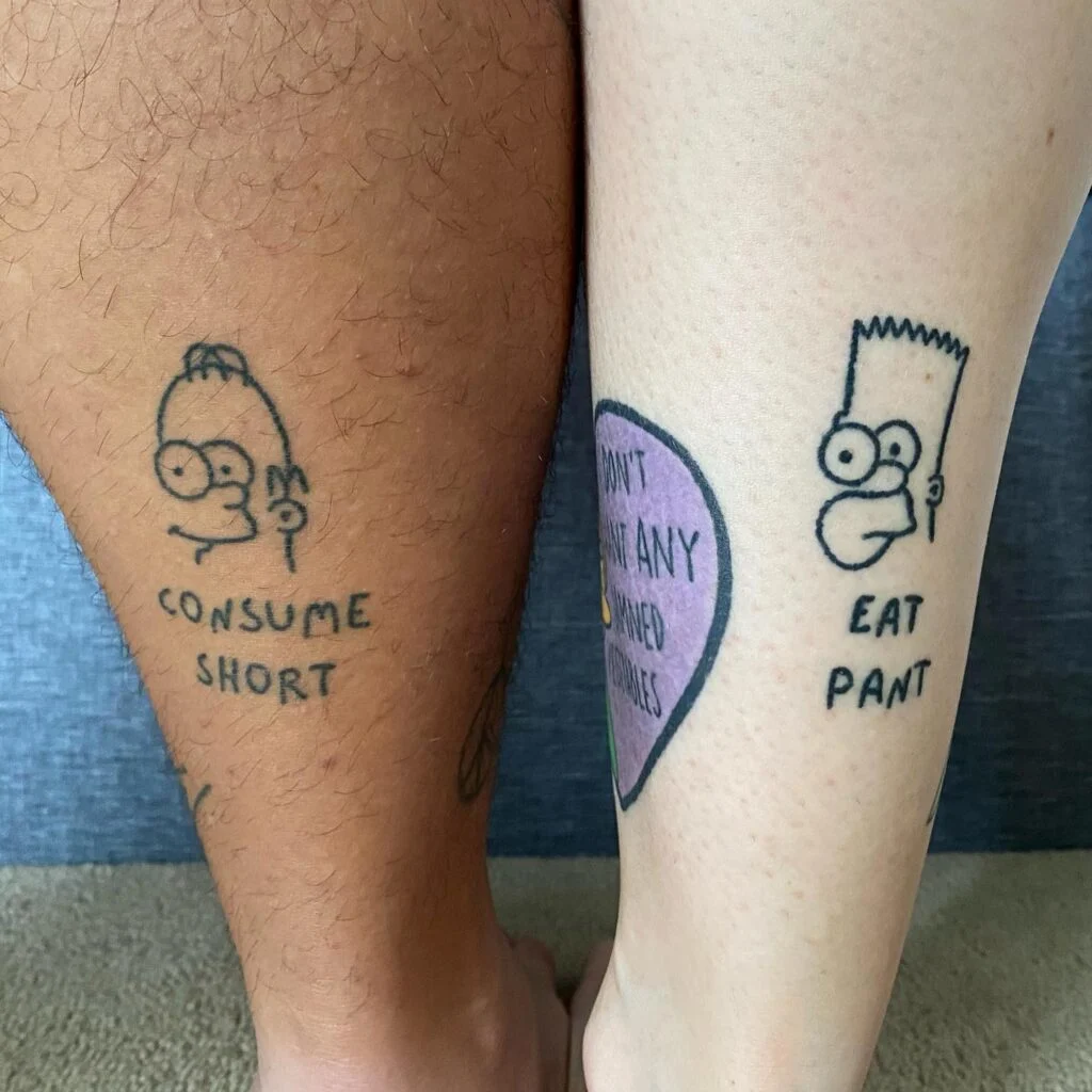 These matching tattoos feature hilarious meme versions of Homer and Bart Simpson with deliberately misspelled catchphrases.