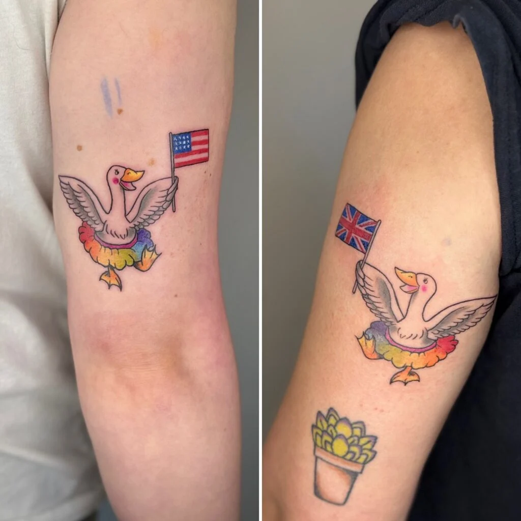 These colorful matching tattoos feature joyful geese wearing rainbow feather skirts while proudly holding different flags.