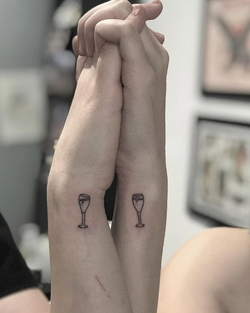 These elegant matching tattoos feature simple black-outlined champagne glasses, perfectly symbolizing shared celebrations and lasting friendship.