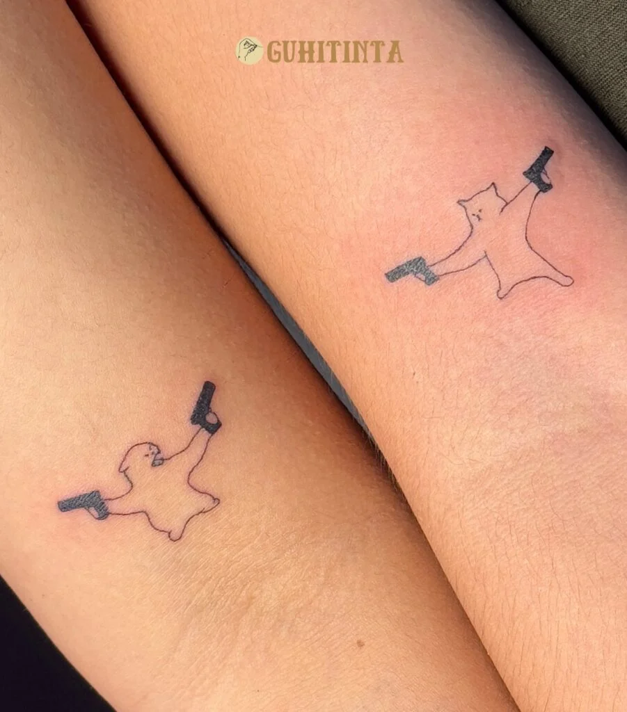 These matching tattoos show mischievous cartoon-style cats dramatically stretching their arms while holding two pistols.