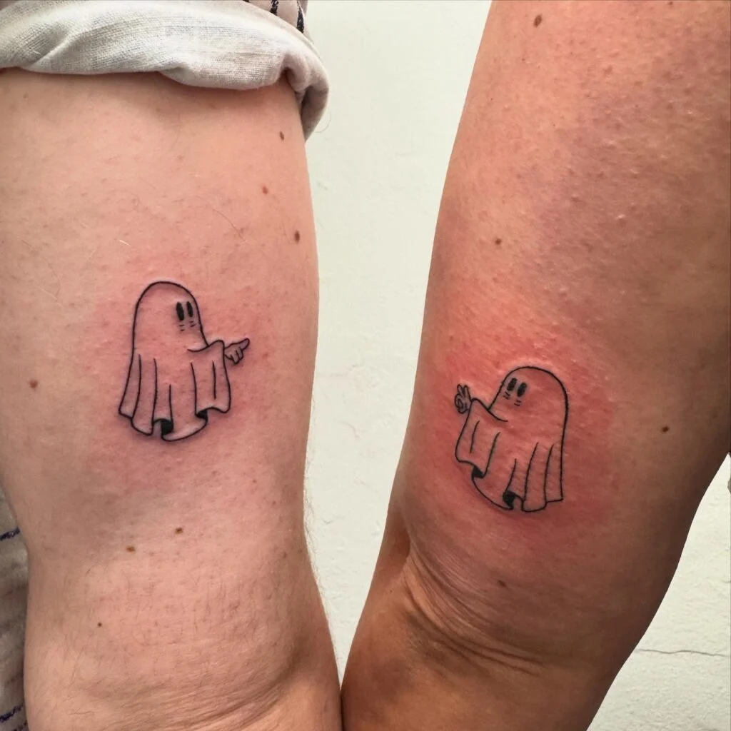 These matching tattoos feature two cheerful cartoon ghosts playfully pointing at each other, creating a fun interactive design.