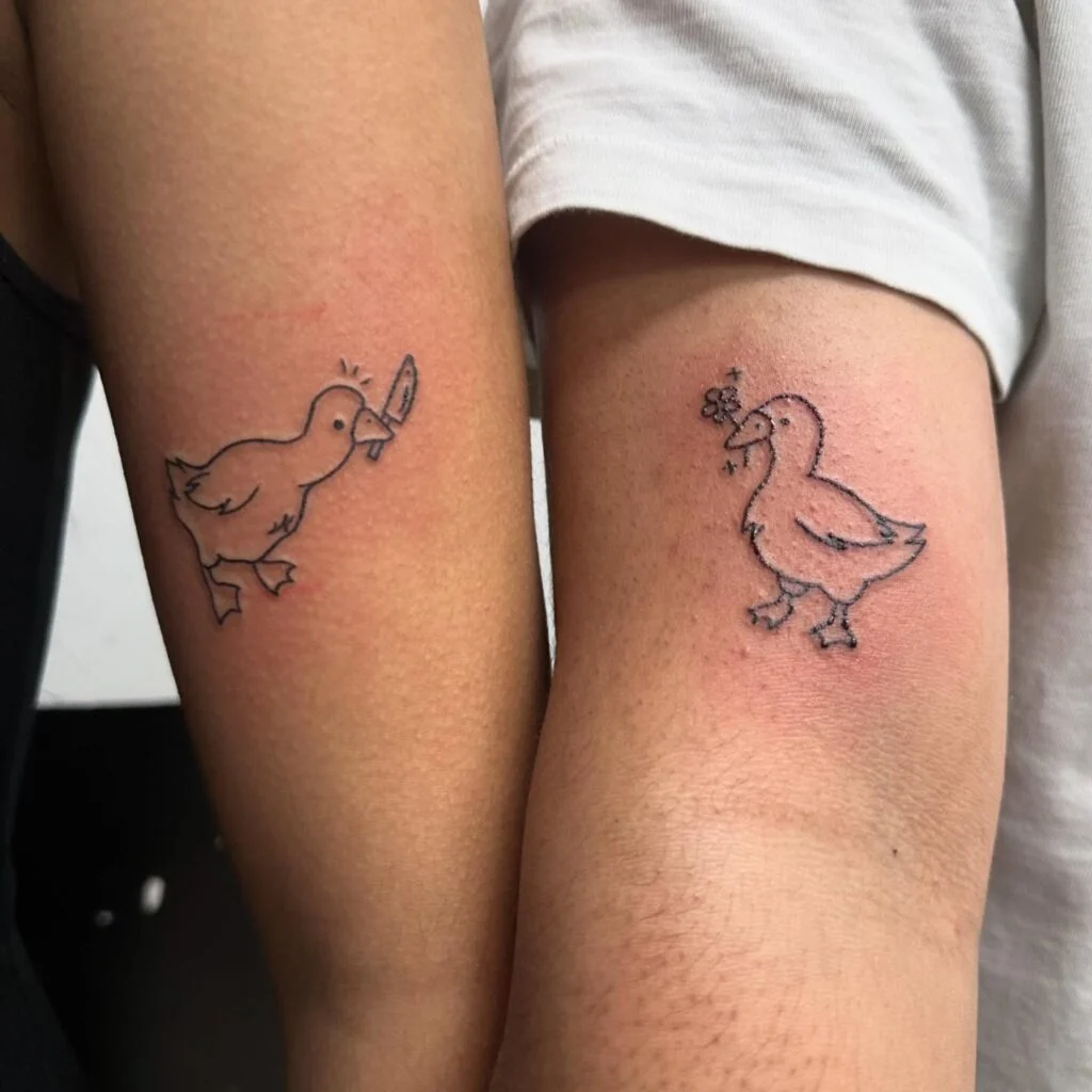 These matching tattoos show two comical geese, each bringing a totally different mood. One goose proudly holding a knife, the other sweetly carrying a tiny flower.