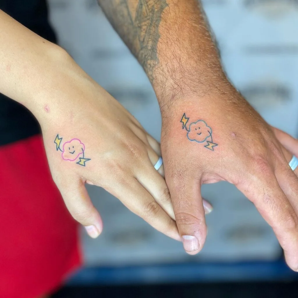 These cheerful matching tattoos feature smiling clouds accented with tiny yellow lightning bolts, creating a fun mix of cute and bold.