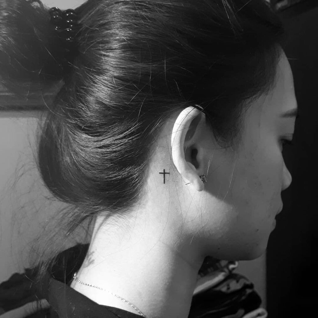 This tattoo presents a solid black cross neatly inked just behind the ear, radiating subtle yet powerful symbolism.