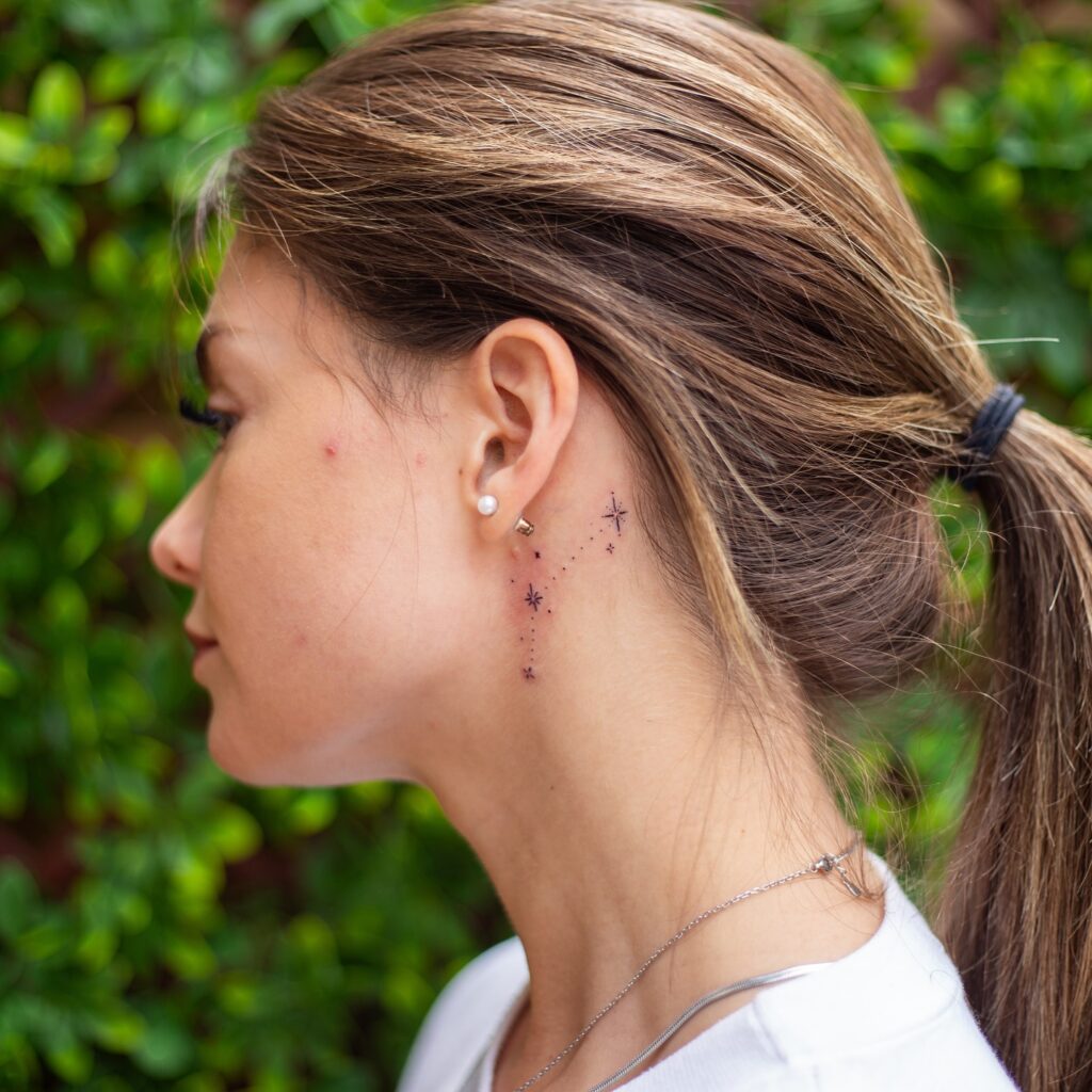 This behind-ear tattoo showcases a delicate constellation made of tiny dots and fine starburst shapes.