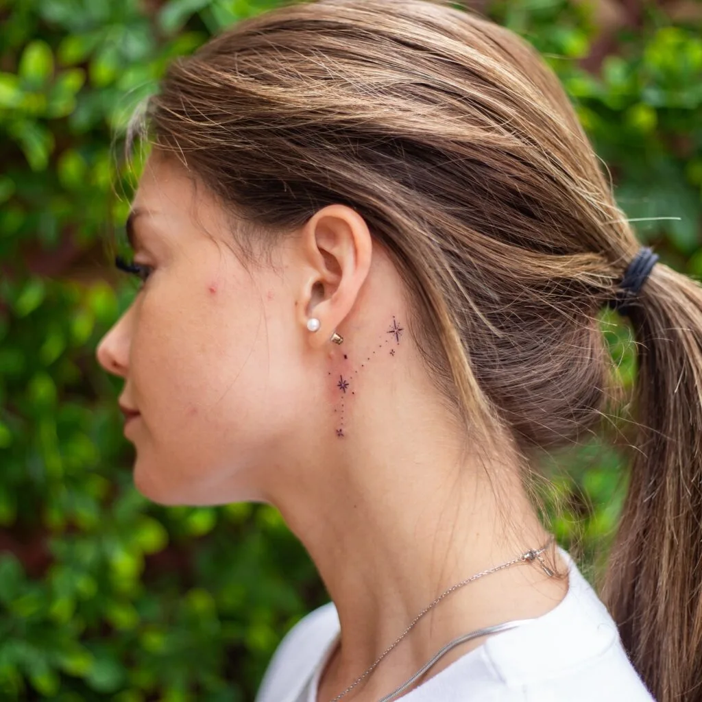 Tiny starburst tattoos behind the ear create a delicate, celestial vibe perfect for everyday wear.