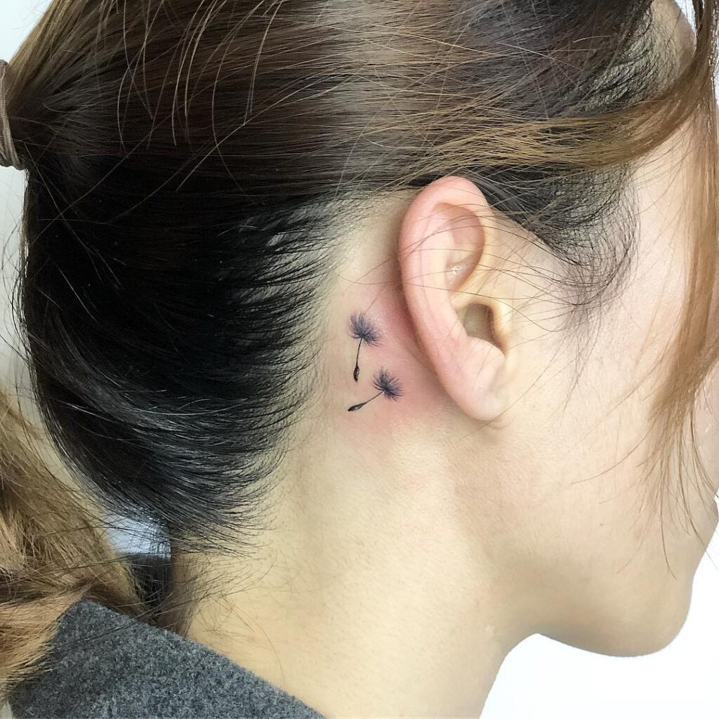 This delicate tattoo shows two floating dandelion seeds, placed neatly behind the ear for a subtle yet artistic look.