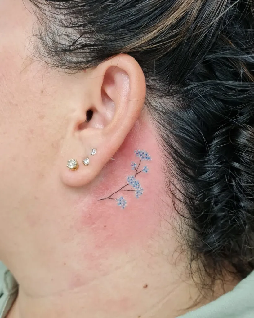 Blue Forget Me Not Behind Ear Tattoo