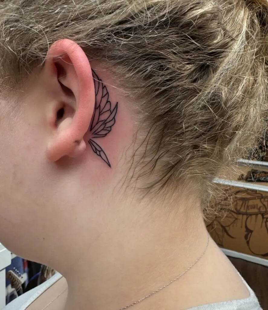This behind-ear tattoo features a single, finely detailed wing that gently follows the ear’s natural curve.