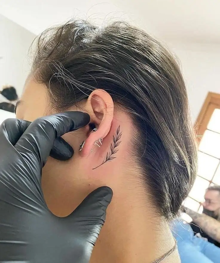 This behind-ear tattoo features a graceful leaf branch drawn with clean black lines and fine shading.