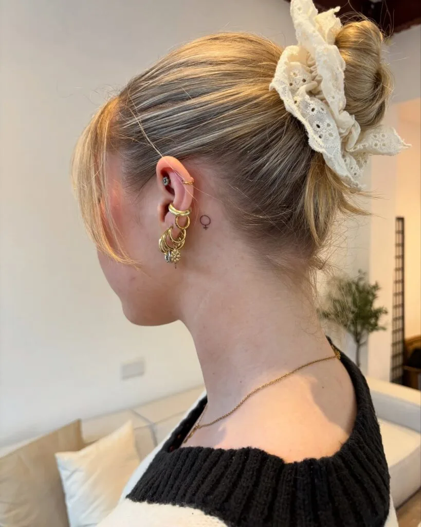 This behind-ear tattoo features the classic Venus symbol, representing femininity, empowerment, and self-love.