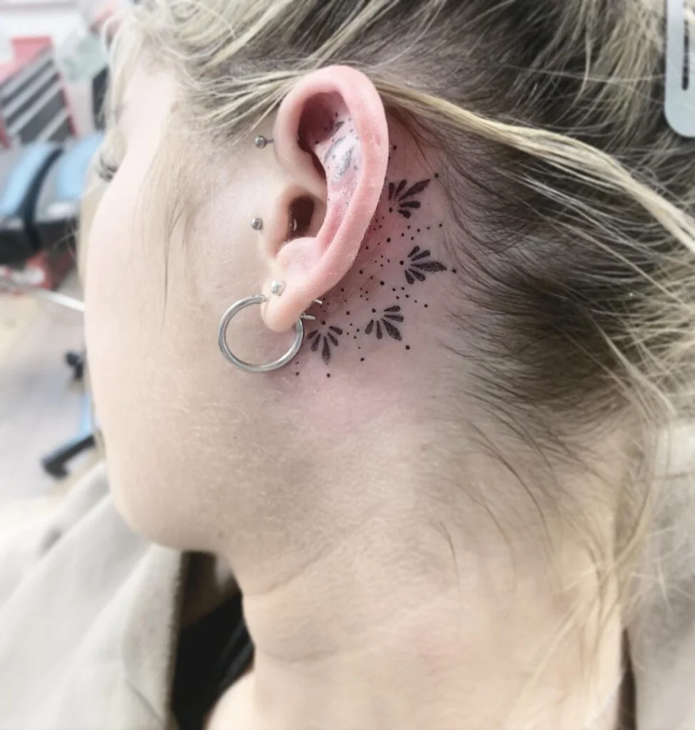 This striking behind-ear tattoo showcases small geometric bursts accented by dotted shading for a dynamic look.