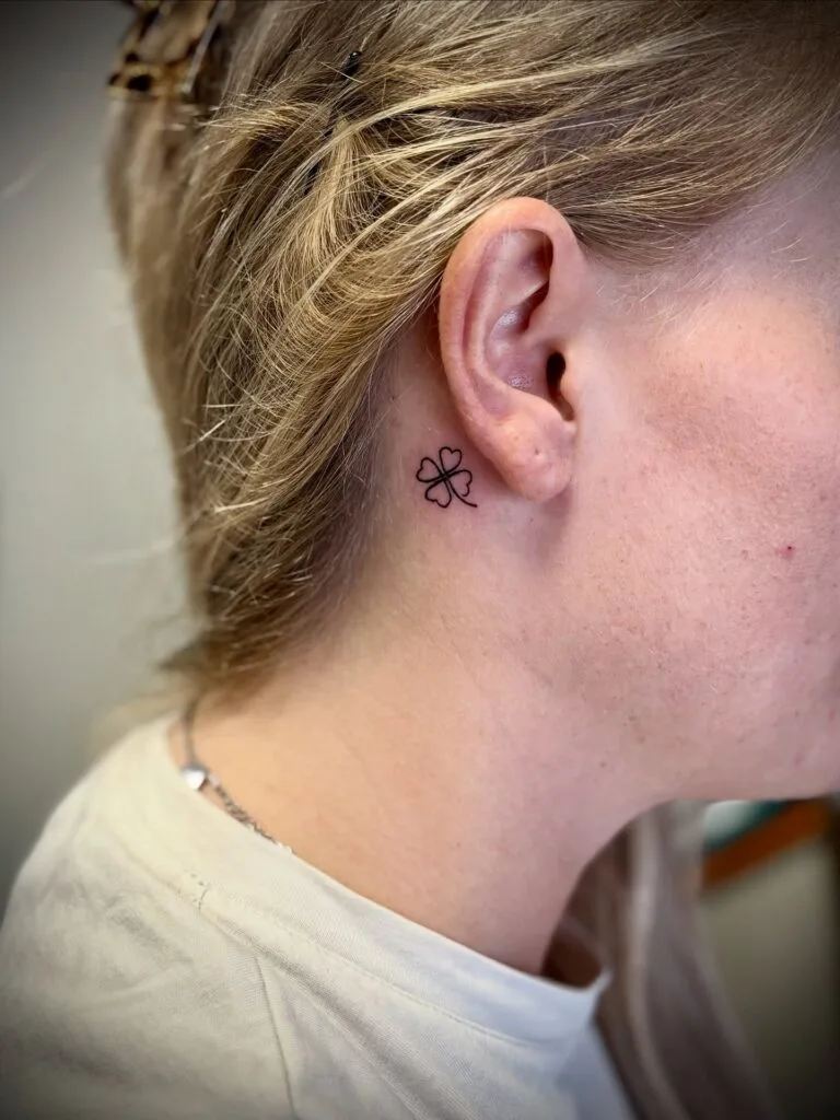 This behind-ear tattoo displays a neatly outlined four-leaf clover with delicate black lines forming each heart-shaped leaf.