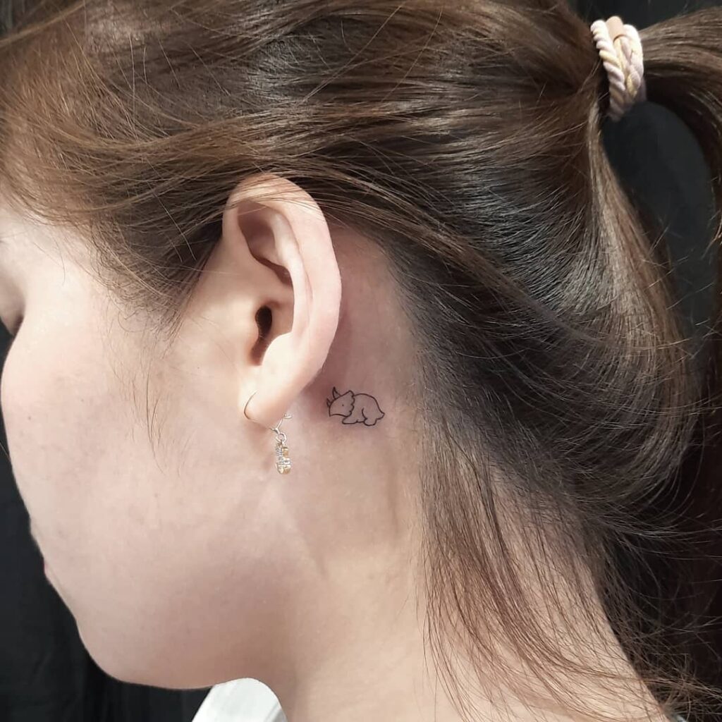 This behind-ear tattoo shows a tiny triceratops outlined in clean black lines, giving it a fun prehistoric charm.