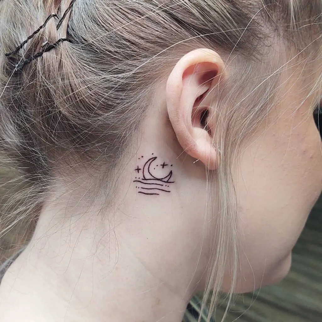 This behind-ear tattoo shows a delicate crescent moon surrounded by small sparkling stars and soft wave-like lines.