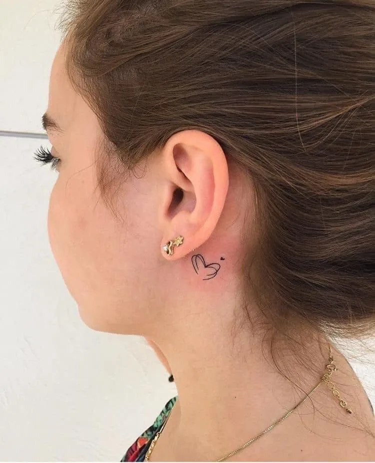 This behind-ear tattoo features a simple black heart outline with a tiny dot accent, creating a sweet minimalist look.