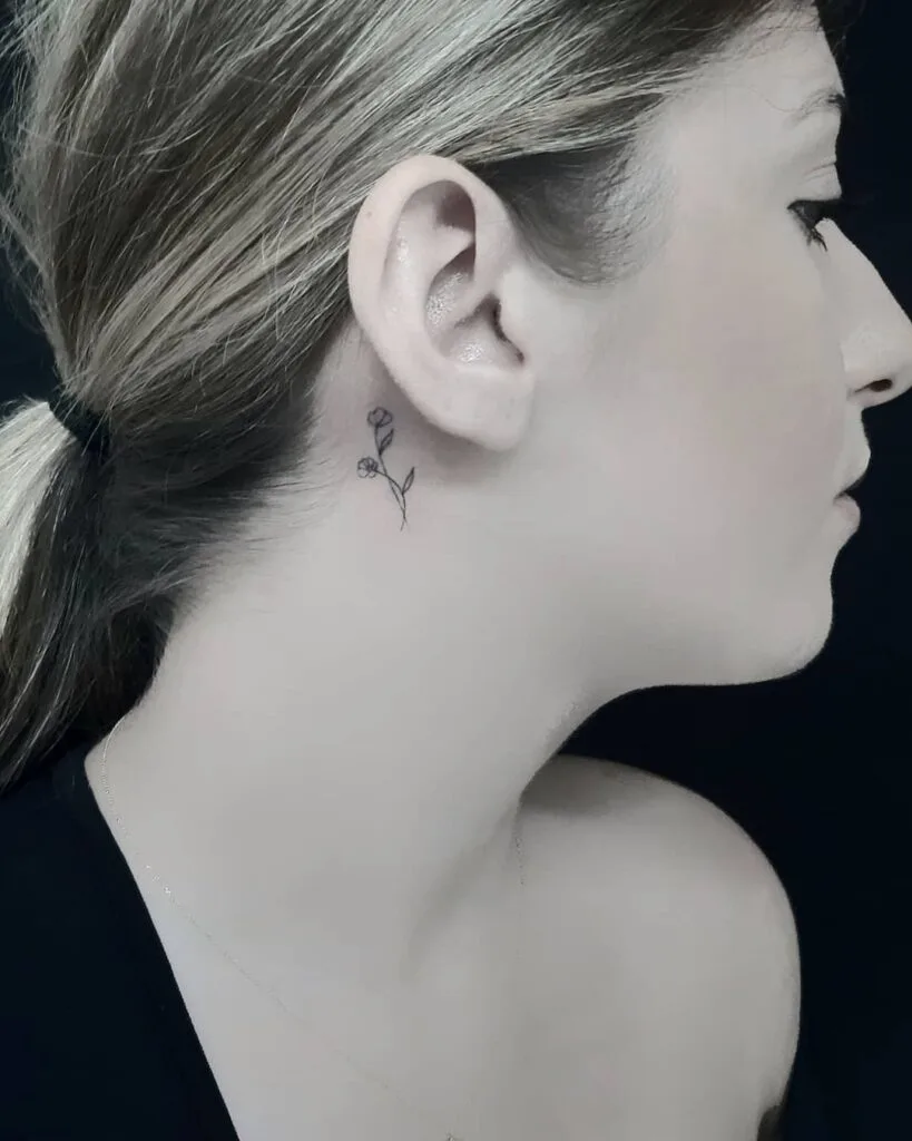 A slender lily tattoo rests gracefully behind the ear, adding quiet charm with elegant, fine lines.