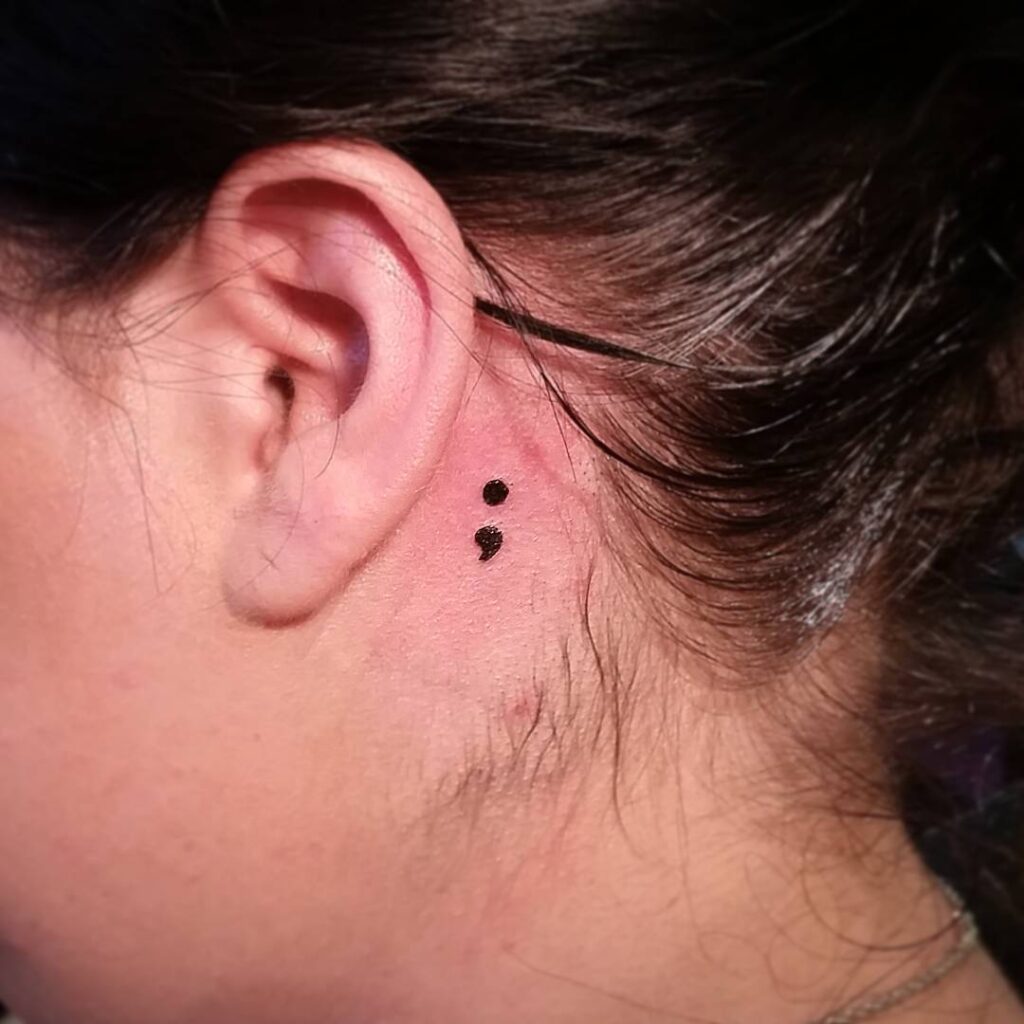 This behind-ear tattoo displays a simple black semicolon, delicately placed for a meaningful yet subtle statement.