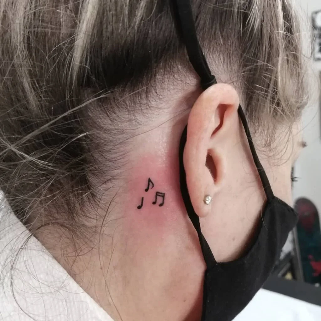This behind-ear tattoo features two neat black music notes, creating a playful and creative design.